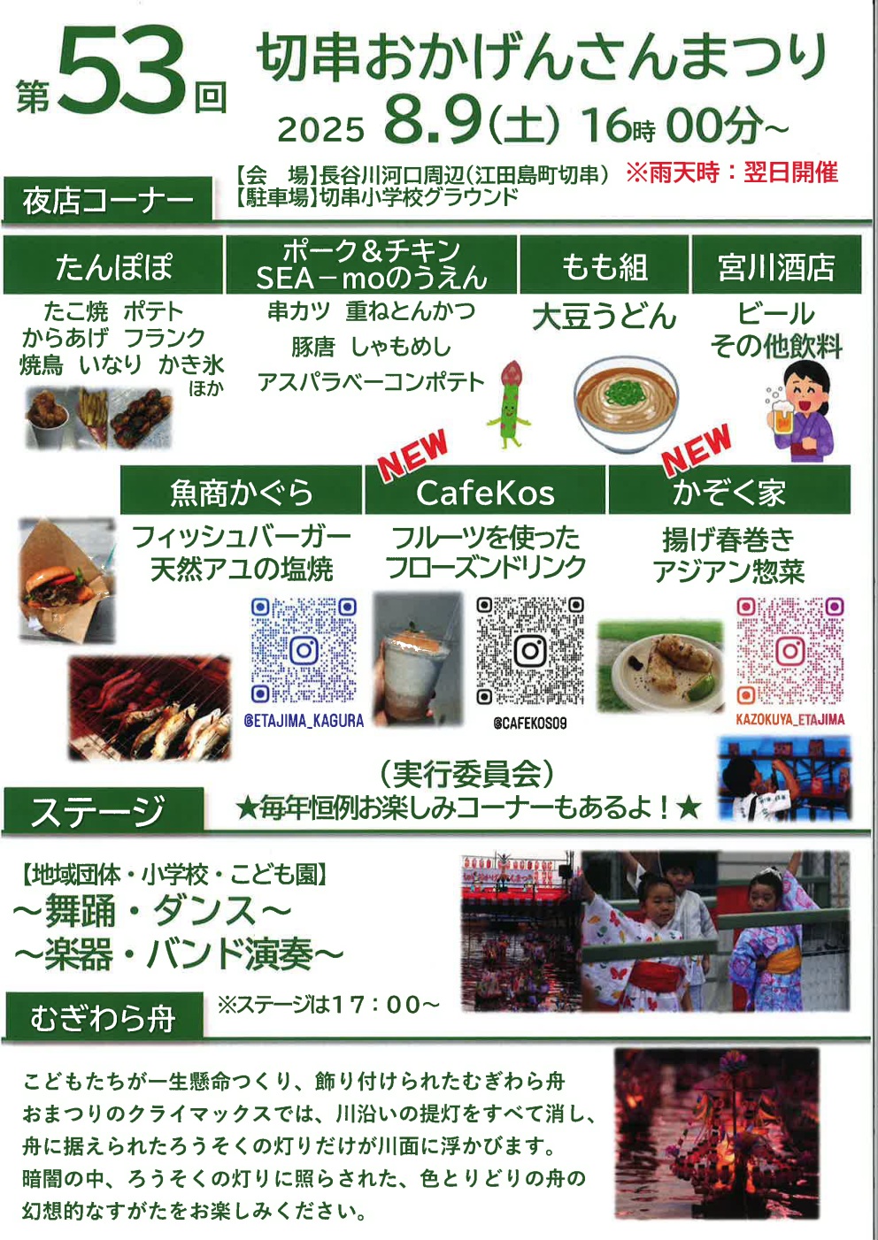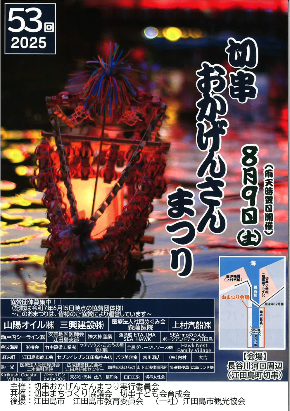 当事務所は、第53回 切串おかげんさんまつりに協賛しています。 このお祭りは、宮島厳島神社の管弦祭が行なわれる旧暦の6月17日(十七夜)にあわせ、願いを込めて作った麦わら船を流す伝統行事です。 島の文化・伝統を次世代に継承し、地域活性化のお手伝いができればと思います。